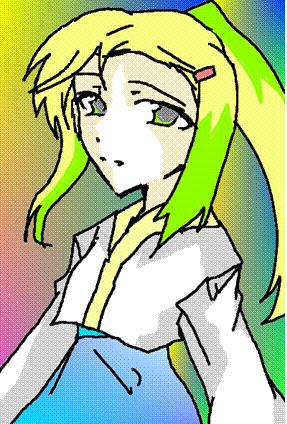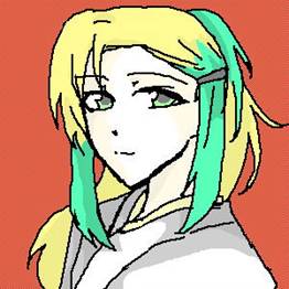 金髪の左右と後ろの髪が一部だけ黄緑。瞳も灰色と薄い黄緑。前髪は右にだけ垂らしていて、左の前髪はヘアピンで留めている。
